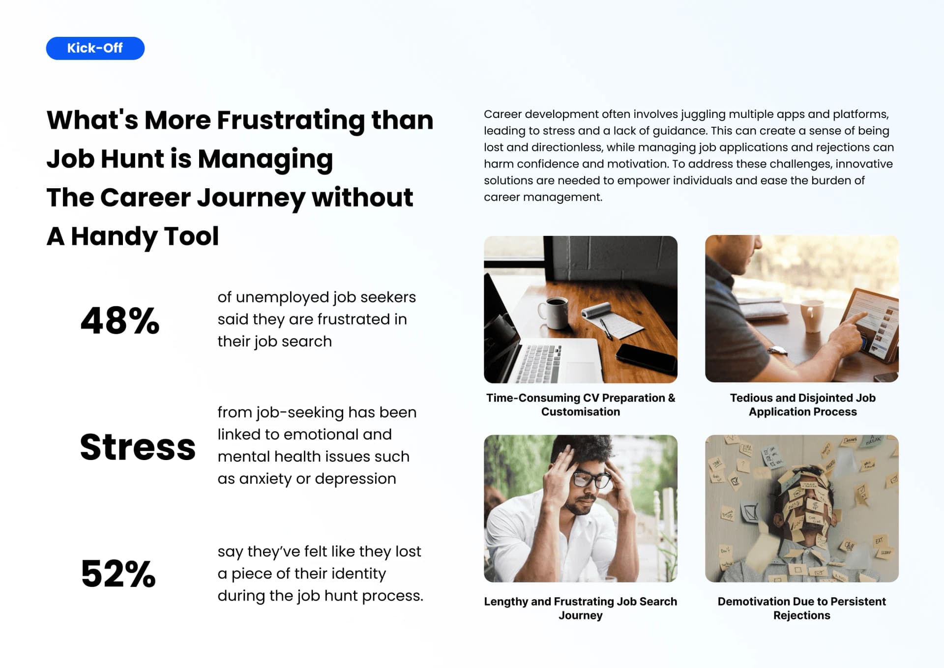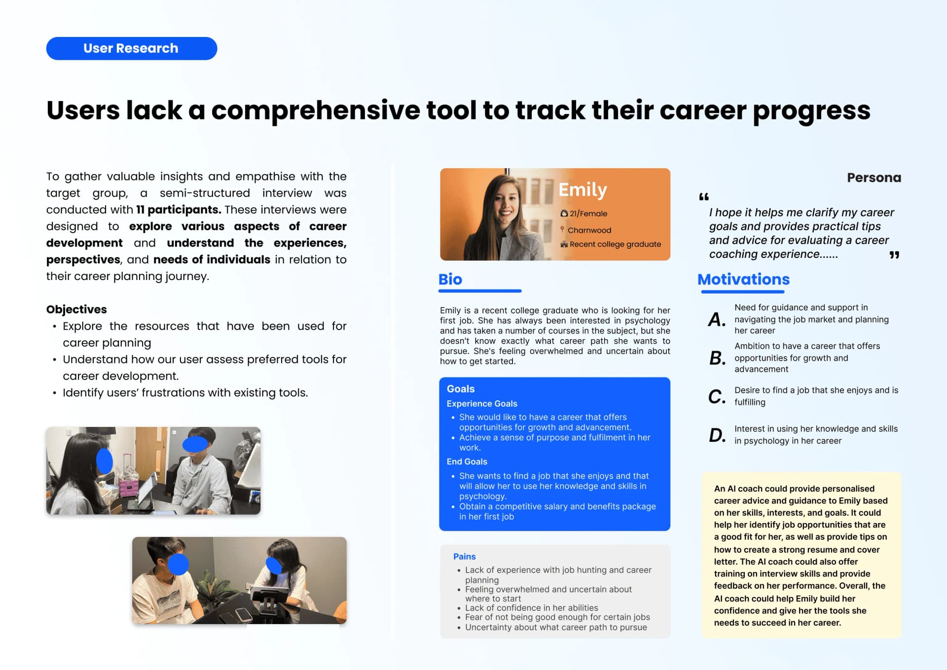 CareerUp is an AI-powered coaching platform that streamlines career development, empowering early-stage professionals with user-centric guidance, continuous conversation, efficient tracking, stress-free productivity, job exploration, and application management in a consolidated space.