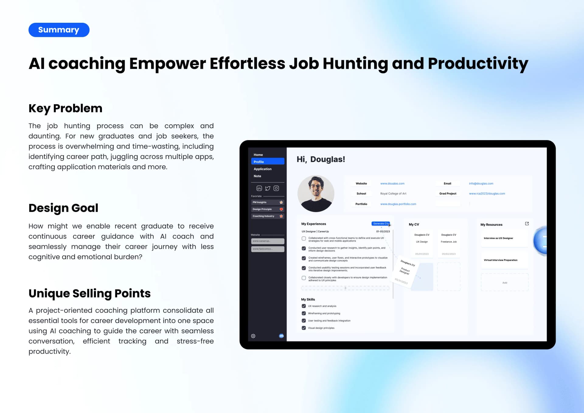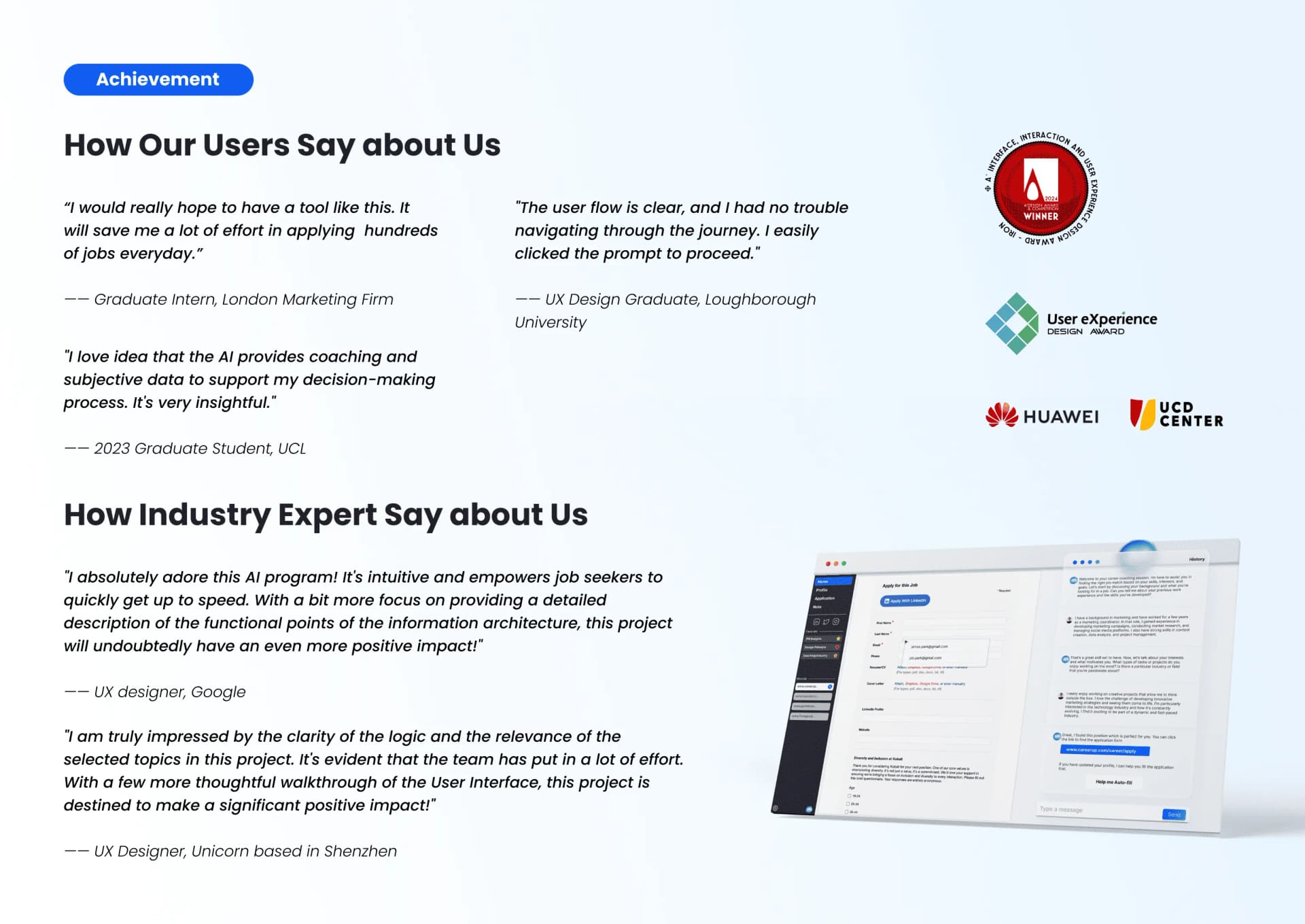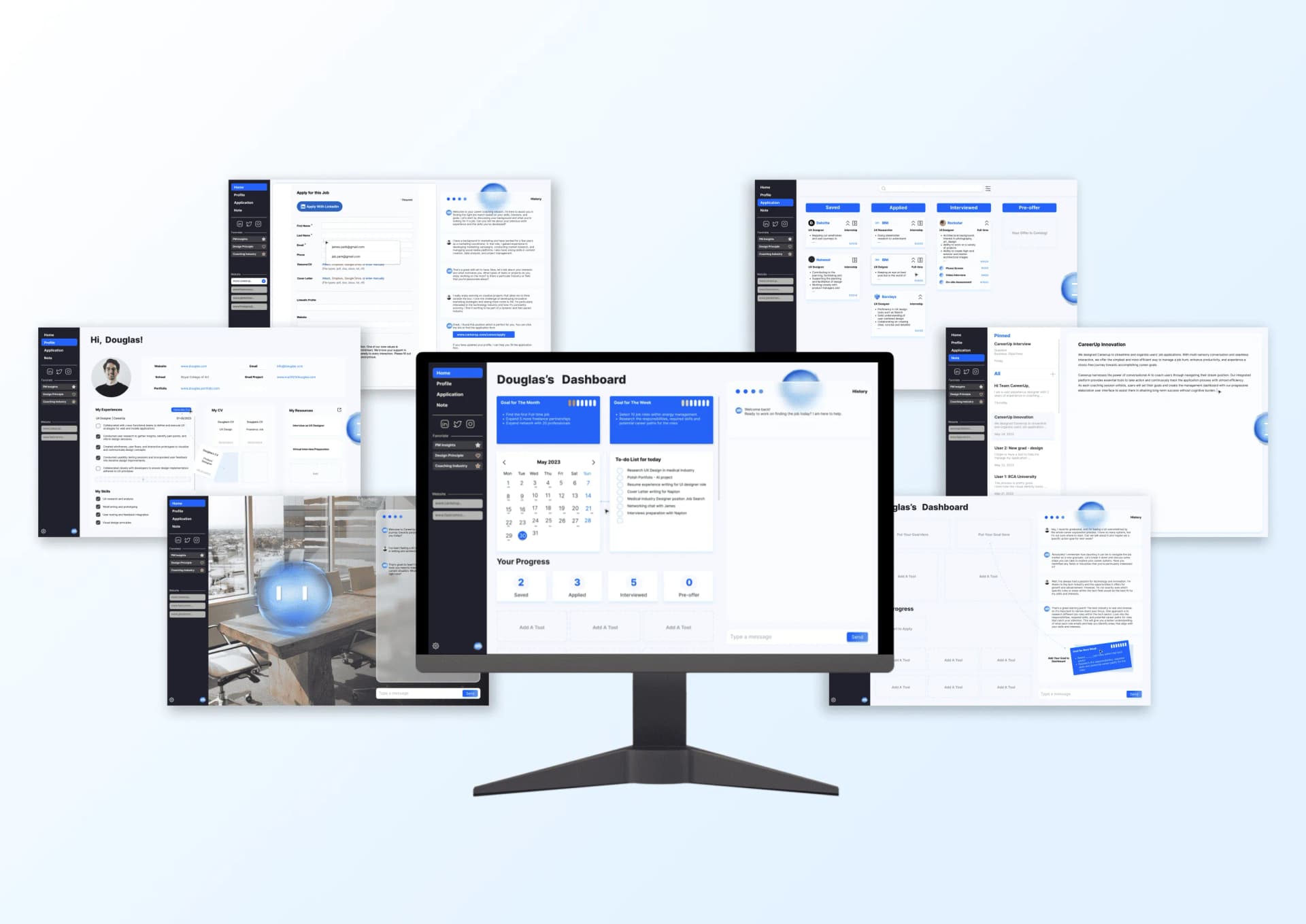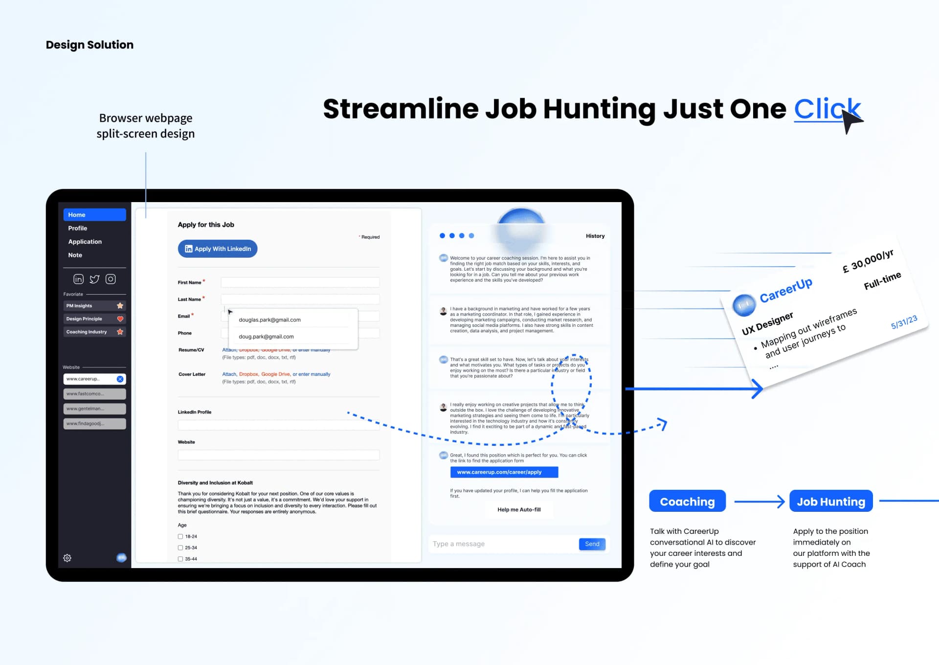I started CareerUp as a side project with a group of designers during the rise of LLMs, when AI began reshaping the world. Our goal was to prototype an AI-native product that used the browser as a medium to automate and organize every aspect of a professional's career journey — from job searching and applying to building personalized career memory. The project went on to win the A' Design Award 2024 and earned National Third Place at the UXDA Awards.