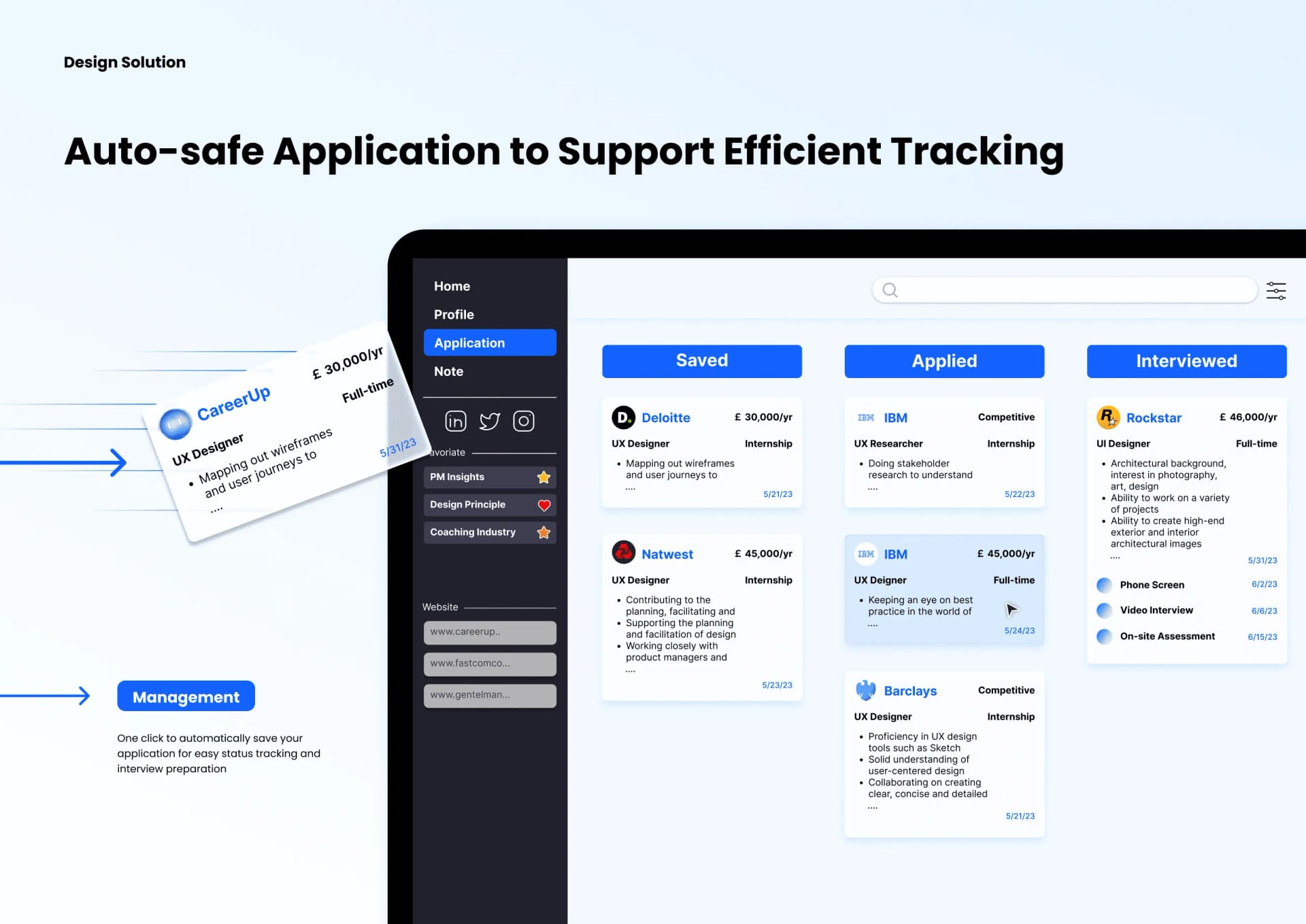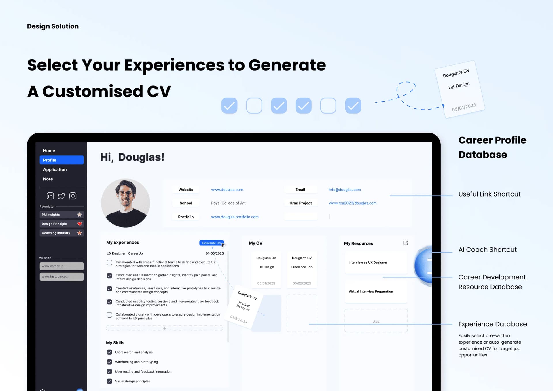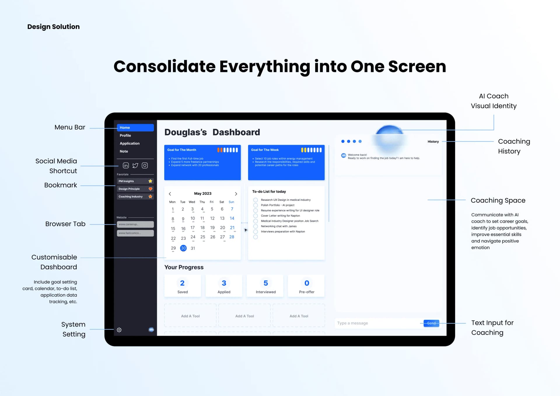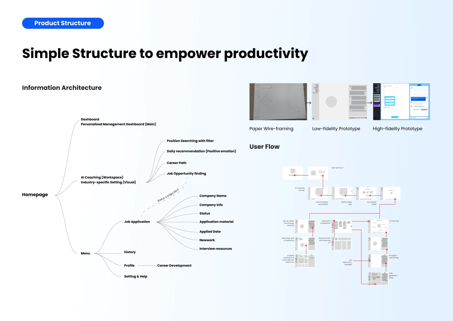 I started CareerUp as a side project with a group of designers during the rise of LLMs, when AI began reshaping the world. Our goal was to prototype an AI-native product that used the browser as a medium to automate and organize every aspect of a professional's career journey — from job searching and applying to building personalized career memory. The project went on to win the A' Design Award 2024 and earned National Third Place at the UXDA Awards.